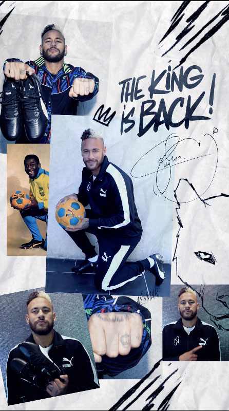 Trong một thông điệp gửi đến người hâm mộ trên các kênh truyền thông xã hội của anh ấy có tựa đề “The KING is Back”, Neymar Jr đã nói về tầm ảnh hưởng mà những cầu thủ vĩ đại của bóng đá như Pelé và Maradona đối với cuộc sống của anh ấy và quyết định của anh ấy theo bước chân của họ bằng cách hợp tác với PUMA